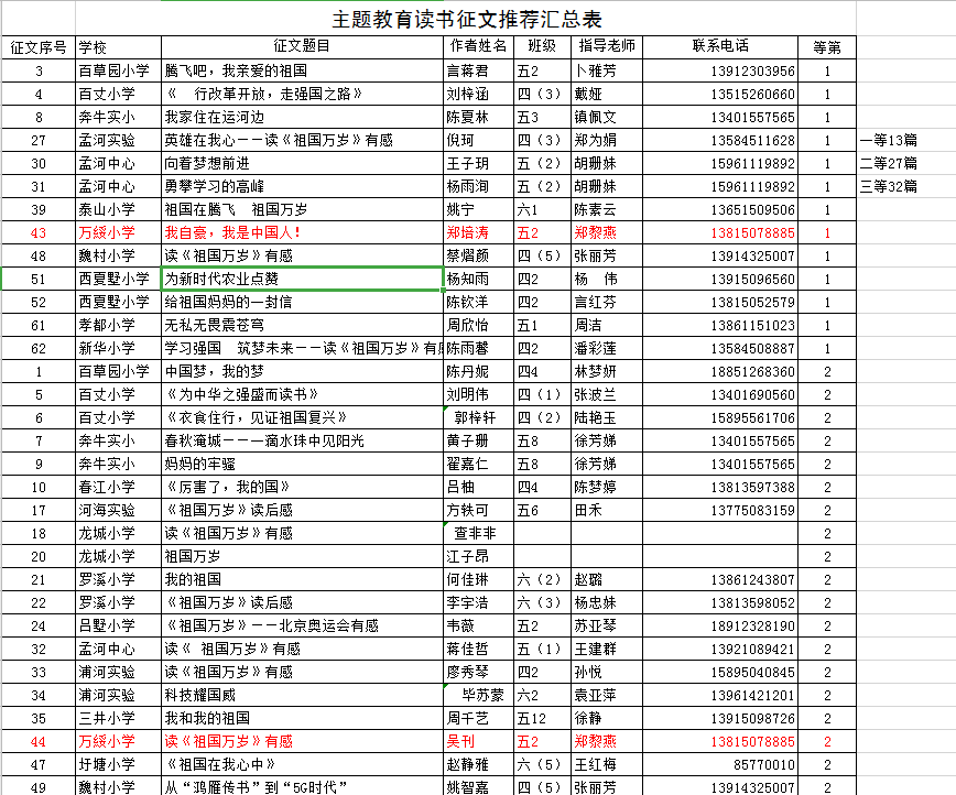 2019区“庆祝中华人民共和国成立70周年”主题教育读书征文获奖情况