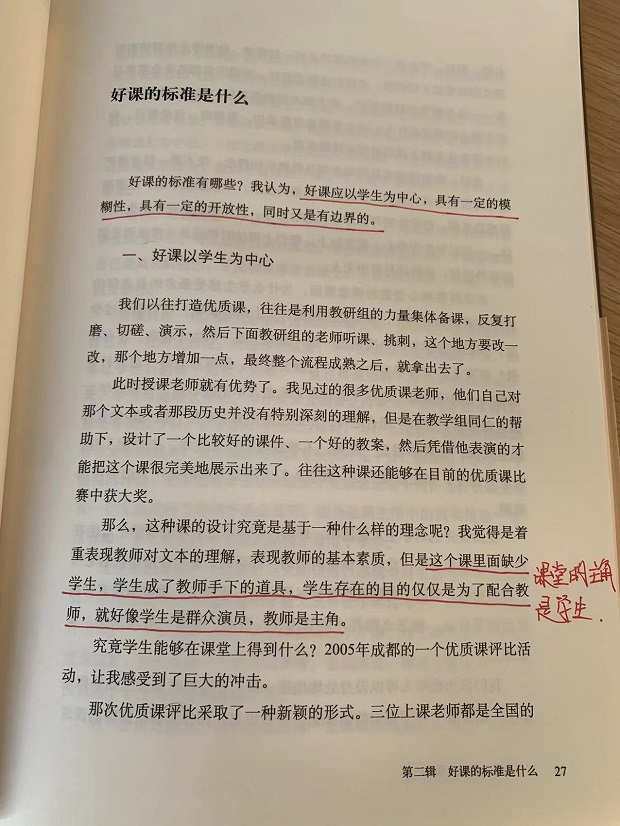 究竟怎样的一节课才能称得上是好课?相信这是所有老师都会思考的问题。魏老师认为好课应以学生为中心,具有一定模糊性,具有一定的开放性,同时又是有边界的。课堂的主角是学生,课堂要服务于学生的成长,一切为顺应学生的成长而设置。而只有让学生感受到自己是课堂的主人时,才能在课堂上说出自己的想法,才能在原有的基础上生成新的知识和见解。但课堂上自然生成的一些话题以及各种突发状况并不是老师所能预料到的,而老师如何处理这一系列的状况是这节好课的重点。在我们的课堂上不要仅仅局限于某一学科的教学,学科间是融会贯通的,这样的课堂学生受益良多。开放性的课堂要求我们吸纳更多不一样的观点和内容,但是并不代表没有边界,对于那些远离事实及逻辑的言论,我们要坚决抵制,不能让其进入课堂,扰乱学生,要给学生们构建一节美好的课堂。