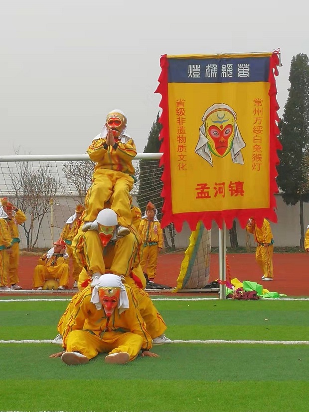 操场上,江苏省非遗项目万绥猴灯的小传人们,穿好戏服,戴上面具,为大家带来了精彩的民俗表演,诙谐的动作让现场观众捧腹大笑,整个校园洋溢着浓浓的节日气氛。