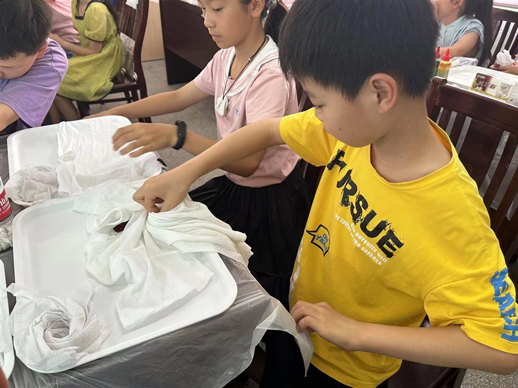 大家充分发挥自己的巧思,对白短袖、白布进行不同形式的捆绑、勒扎。在同学们天马行空的想象和一双双“妙手”之下,原本普普通通的布料,经过不同方式的捆扎和颜色的浸染,变成了一件件独一无二的艺术作品。