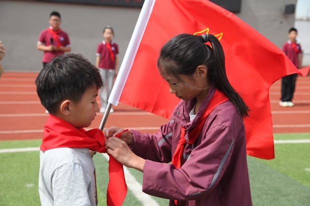 接着,高年级同学代表老队员给新队员佩戴红领巾,当老队员亲手把鲜艳的红领巾戴在新队员的胸前,新队员的那份激动与骄傲无以言表,小队员们自豪地向哥哥姐姐们回敬标准的队礼。76名新队员在大队长吴一寒的带领下举起稚嫩的拳头宣誓,在铿锵有力的宣誓声中,成为了一名真正的少先队员。