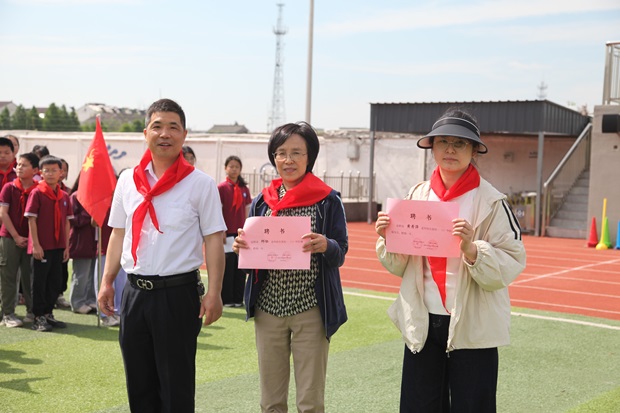 大队辅导员韩银老师宣读了入队决定和新队员名单,高伟明校长给新成立中队授予中队旗,同时聘请邱钰、黄秀萍两位老师为一年级中队辅导员。
