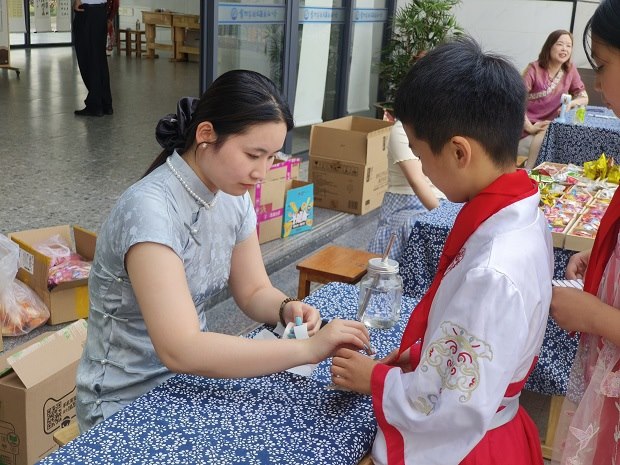 活动大厅化身为非遗市集,感官盛宴在此上演。开花团子如花绽放,常州茶香氤氲着“茗香雅韵”,匠人巧制的漆扇流光溢彩,更有鳝丝面以“鳝意匠心”俘获味蕾。当孩子们用集满的贴纸换取一份非遗小吃或亲手体验一次传统手作,文化传承便从舌尖浸润至心田。身着汉服的身影更是活动中流动的风景,额外收获的“百搭”贴纸,为文化自信增添了一抹亮色。